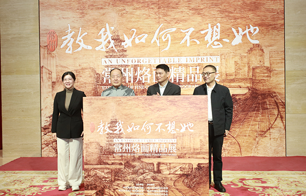中国美术馆党委书记杨雄,常州市政协副主席、市教育局局长完利梅,市委宣传部副部长谢春林,与江苏省省级非遗烙画代表性传承人汪鹤鸣共同为展览揭幕。