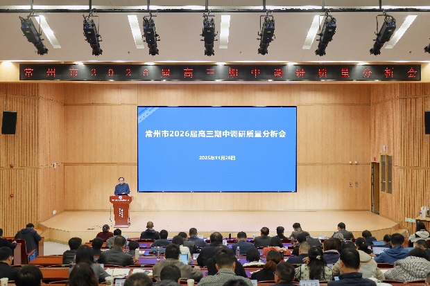 11月26日下午,常州市2026届高三期中质量调研分析会在常州市教科院附属高级中学召开。市教育局副局长戚宝华,市教育局基教处负责人、市教科院相关负责人出席会议。各辖市(区)教育局分管局长、教育科长、教师发展中心主任,全市高中校长、分管校长、主任,以及高中各学科教研员参加会议。